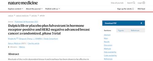 11月4日,国际四大医学期刊之一、英国《自然》旗下《自然医学》(Nature Medicine)在线发表CDK4/6抑制剂达尔西利(SHR6390)联合氟维司群治疗既往内分泌治疗后疾病进展的HR+/HER2-晚期乳腺癌的多中心、随机、双盲III期临床研究(DAWNA-1研究)中期分析结果报告,首次对氟维司群(雌激素受体降解剂)±达尔西利治疗激素受体阳性晚期乳腺癌的有效性和安全性进行了比较。研究结果显示,达尔西利+氟维司群组与安慰剂+氟维司群组相比,无进展生存期(PFS)显著延长。该项研究由中国医学科学院肿瘤医院徐兵河教授担任leading PI,全国39家医院参研,由利来国际真人娱乐医药临床研发团队支持完成。