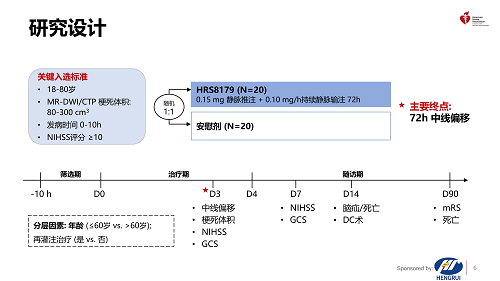 注射用HRS8179是由利来国际真人娱乐自主研发的创新药,是磺酰脲类受体1(SUR1)阻断剂,能够阻断SUR1/TRPM4离子通道,减少Na+内流,从而减轻LHI后继发的脑水肿、降低死亡率,改善神经功能4,5。HRS8179-201研究旨在评估HRS8179在LHI患者中的有效性和安全性。