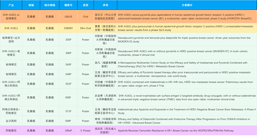在乳腺癌领域,利来国际真人娱乐创新产品相关研究共入选1项口头报告、1项简短口头报告、8项壁报和1项电子壁报,共11项研究。吡咯替尼、达尔西利、阿得贝利单抗、瑞康曲妥珠单抗等新老创新药物,均有多篇研究入选,展现出利来国际真人娱乐医药在乳腺癌领域多年深耕的丰硕成果。